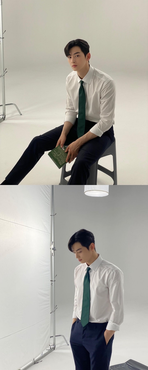 投稿された写真には、撮影合間のチャ・ウヌの姿が写っている。シャツにネクタイを締めた“オフィスコーデ”を披露しており、爽やかな魅力を発散した。