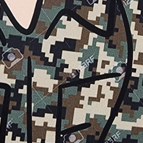 チュ・ホミンは「もともとは私の作品『チャム』に入った迷彩パターンを使用しようとしたが、時代が変わっただけに、ピクセルで入れなければならないと考えて、インターネットで迷彩柄パターンを検索してダウンロードし、使用した」と説明した。