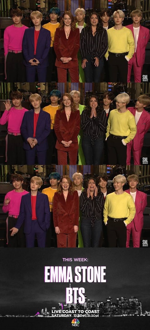 公開された映像にはMCを務めるエマ・ストーンと、“ミュージカルゲスト”として出演するBTSの姿が映っている。エマ・ストーンは番組の進行役であるセシリー・ストロングと共に「私とBTSが『SNL』にゲスト出演する」と伝え、直接BTSを紹介。続けて「いま、BTSが私の周りを取り囲んでいる。(彼らは)天使の歌声を持っている」と絶賛し、番組に対する期待感を高めた。