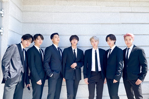 写真の7人は、ステージ上で見せる華やかな姿とは一転、全員がシックなスーツ姿を披露。普段カラフルな髪色も、J-HOPEとSUGAを除く5人が黒髪になっており、お手本のようなフォーマルスタイルを見せている。