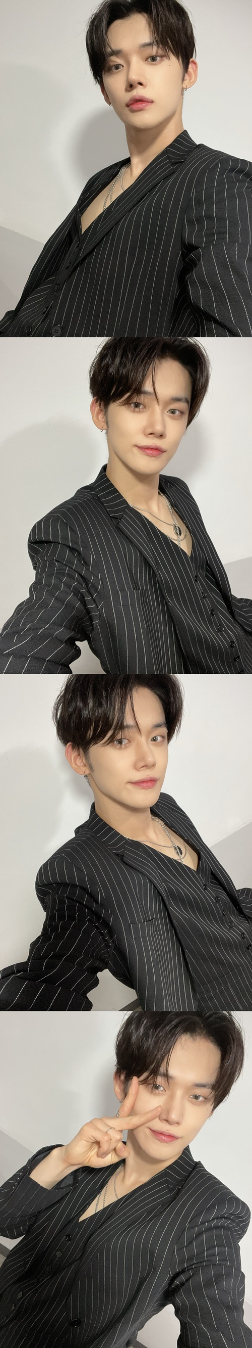 写真のYEONJUNは、胸元が開いたストライプのベストとジャケットを着用。大胆な胸元から男のフェロモンが漂っている。