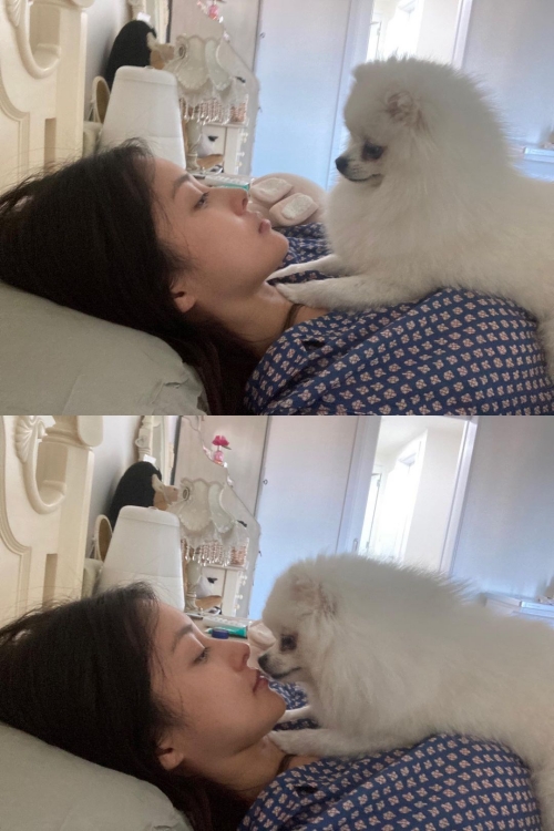 投稿された写真には、ベッドの上で愛犬ポロンと戯れるギュリの姿が写っている。