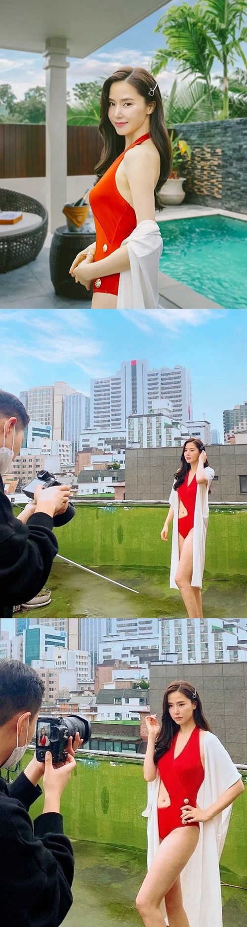 公開された写真には、水着姿で撮影中のコン・ヒョンジュが。最近結婚式を挙げた彼女は、ぜい肉一つないスリムな体系でファンを驚かせている。