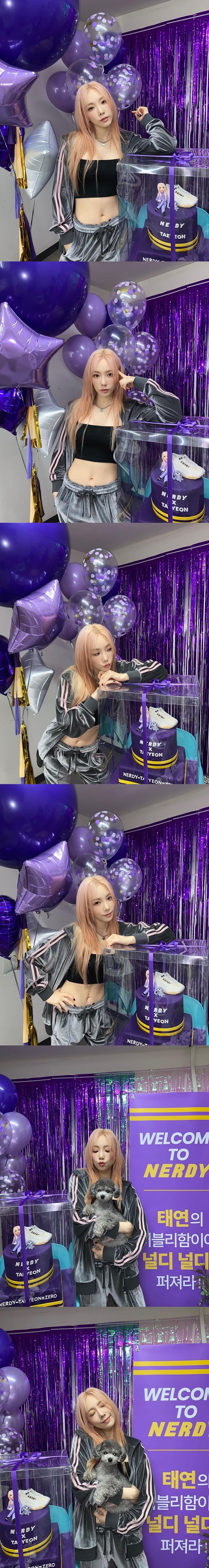 「NERDY×TAEYON」と書かれたケーキが収められているボックスに寄りかかる姿や、かわいい犬を抱えて笑みを浮かべる姿が印象的だ。