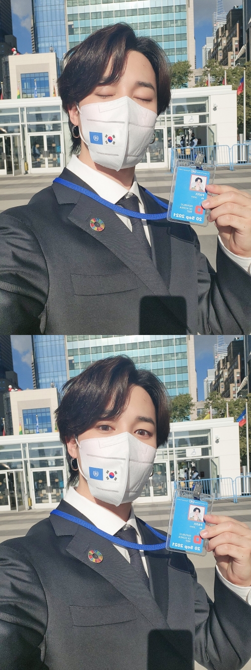 写真には、国連総会に出席したJIMINの姿が。フォーマルなスーツに身を包んでおり、胸に光るSDGsのピンバッジが目を引く。