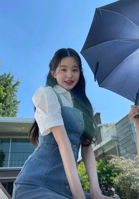 パフスリーブが印象的な白ブラウスにデニムのビスチェを合わせた、キュートなスタイルを披露したチャン・ウォニョン。少女漫画から出てきたようなビジュアルで見る者を釘付けにした。