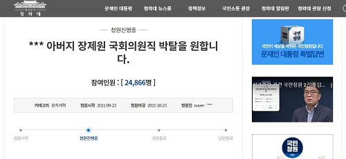 その請願者は「チャン・ジェウォン議員の息子の相次ぐ犯罪行為で、チャン・ジェウォン議員が父親として、その責任がないとは見られない」とし、「なぜなら彼のあのような行為をできる自信は、彼の父親が国会議員だから生まれたと考える」と述べた。