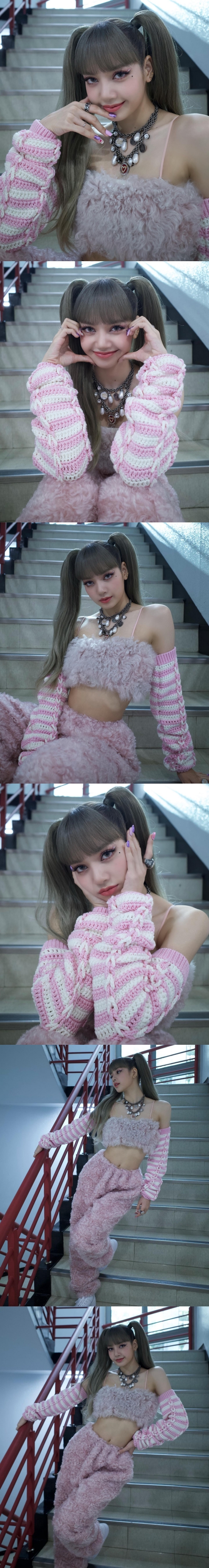 公開された写真には、階段で写真を撮るリサの姿が。高い位置で結んだツインテールに、華奢な鎖骨と二の腕、スリムなウエストが目立つ衣装が目を引く。