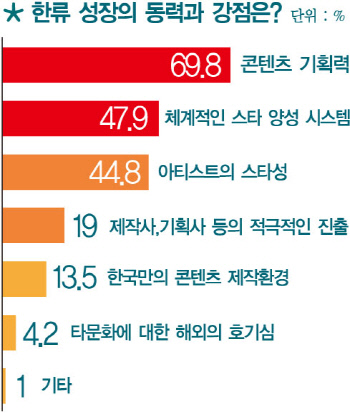 韓流の主な原動力と強み、そして競争力を問う質問(複数回答)では、「コンテンツ」と「スター」に票が集まった。アンケートの結果、「コンテンツ企画力」(67票)が圧倒的な支持を得ており、「体系的なスター養成システム」(46票)、「アーティストのスター性」(43票)、「制作会社、プロダクションなどの積極的な海外進出」(18票)がそれぞれ2~4位となった。