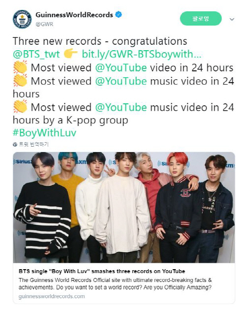 さらに、4月18日にはギネス世界記録の公式SNS上でもBTSの新記録が伝えられた。