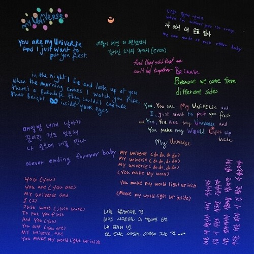 9月24日13時に発売された『My Universe』は、コールドプレイが来る10月15日に発売する9枚目のフルアルバム『Music of the Spheres』の先行公開曲だ。クリス・マーティンは、この歌をコラボするために、4月に韓国を訪れてBTSと会っていたことがわかった。BTSはコールドプレイYouTubeオリジナルの週間ミュージックショー「RELEASED」のスペシャルエピソードに出演したりもした。