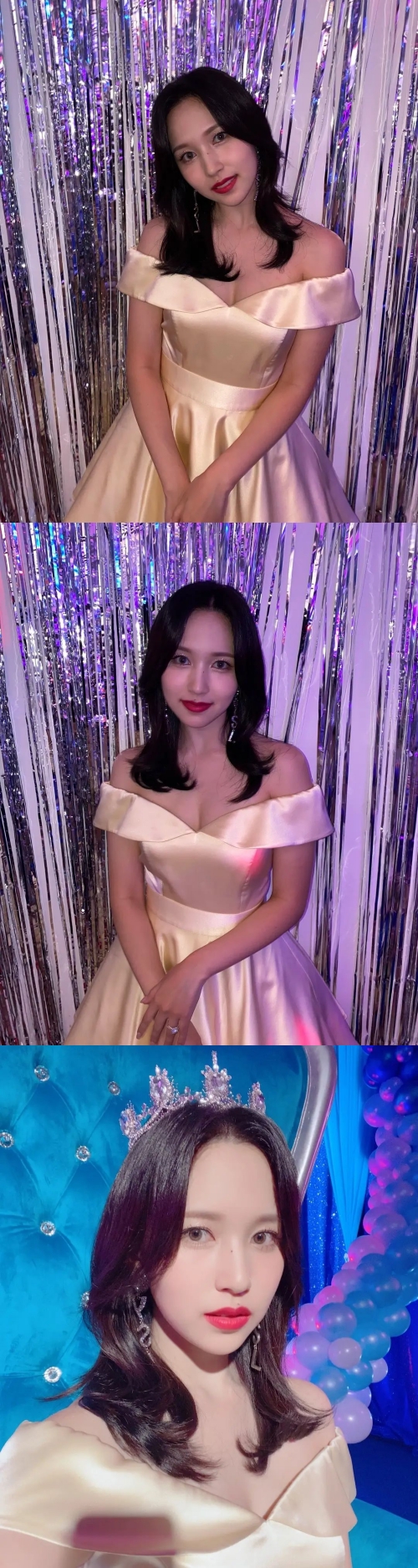 別の写真には、ブルーのソファに腰掛けたまま、カメラを見つめるミナの姿が。ティアラをつけており、まるで本当のお姫様のようだ。