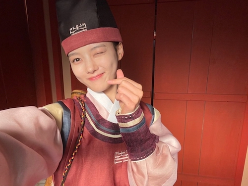 ウィンクしたチャーミングな表情で指ハートを作って見せるという爽やかさは、実に圧巻。キム・ユジョンは現在、韓国SBSの時代劇『紅天機(ホンチョンギ)』出演しており、劇中の画工姿であることからドラマ撮影の合間に撮ったことをうかがわせている。