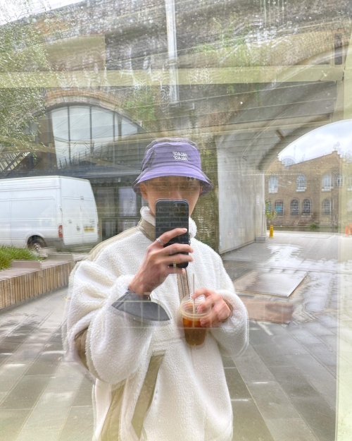 写真の中のパク・ソジュンは、アイスコーヒーを片手に窓ガラスに映った自分を撮影している。バケットハットにフリース素材のアウターを着用し、洗練されたストリートスタイルを披露した。