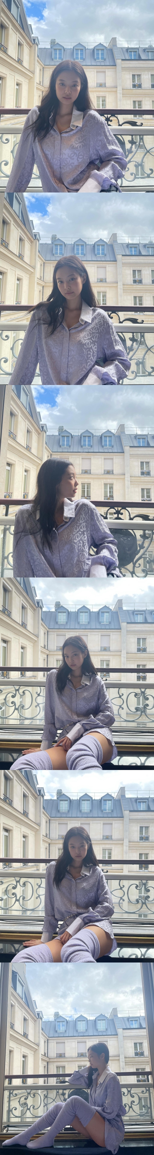自身がアンバサダーを務めるCHANEL(シャネル)のシャツをワンピースのように着用し、同系色のニーハイソックスで太ももの絶対領域を見せた全身ショットを見せつけた。