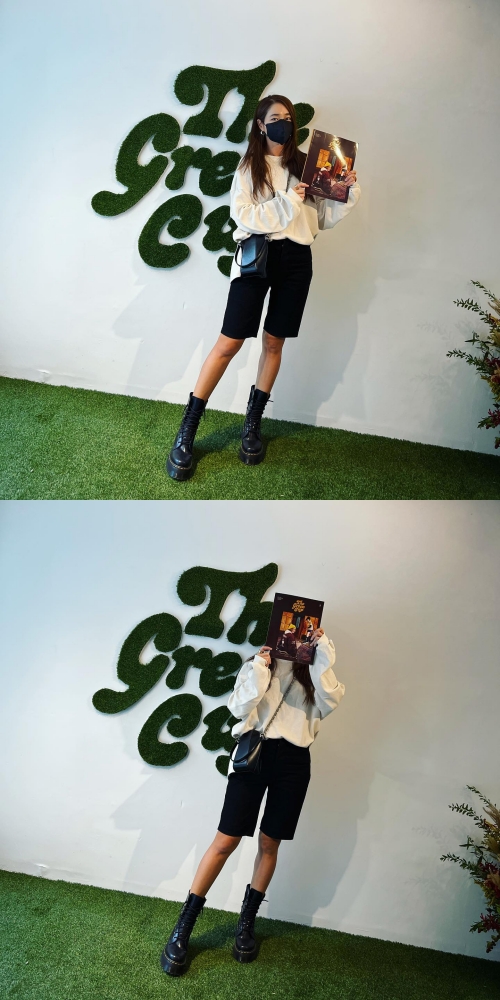 写真には、パンフレットを持ちながらカメラを見つめるイ・ミンジョンの姿が。白のスウェットにハーフパンツ、ブーツを合わせたカジュアルでありながらも洗練されたコーディネートを見せている。