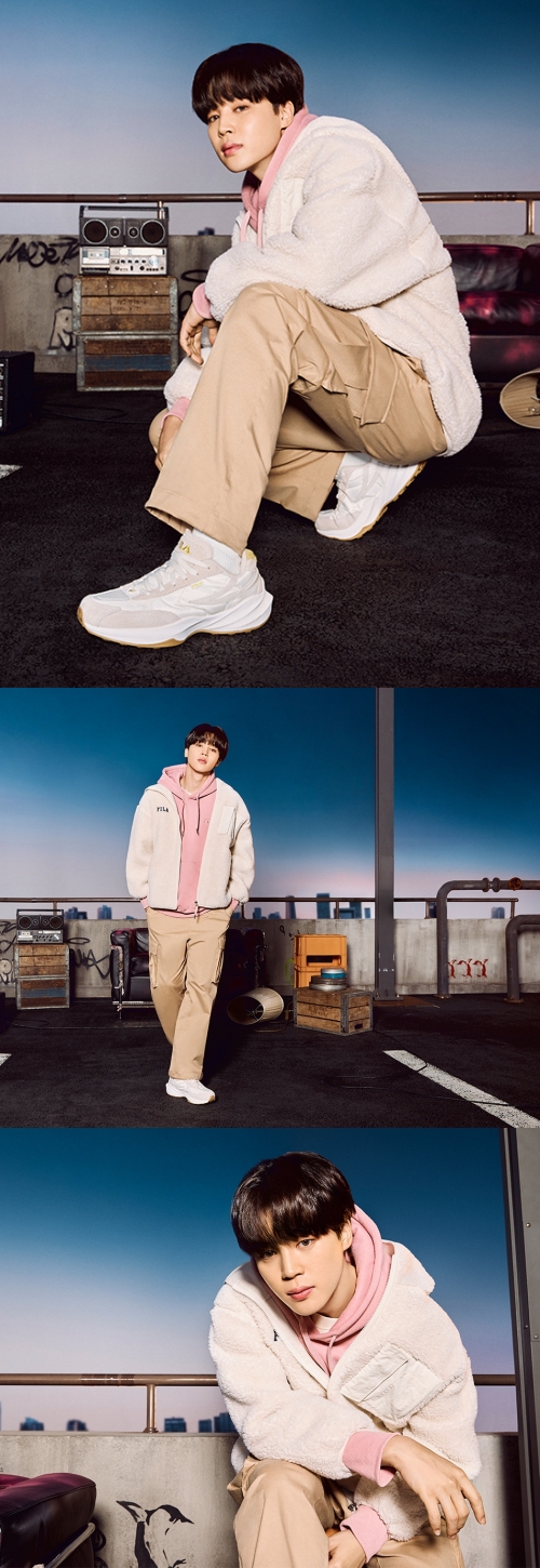 ピンクのパーカーに白のボアジャケットを羽織っているJIMIN。中性的な魅力を発揮しながら、FILAの新作をしっかりと着こなしている。