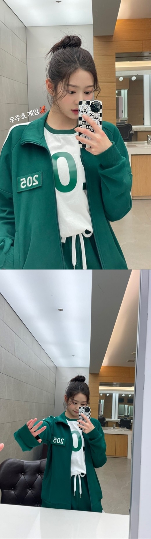 そして、何より目を引くのはその衣装だ。Netflixシリーズ『イカゲーム』を彷彿とさせる、番号が書かれた緑のジャージを着用している。