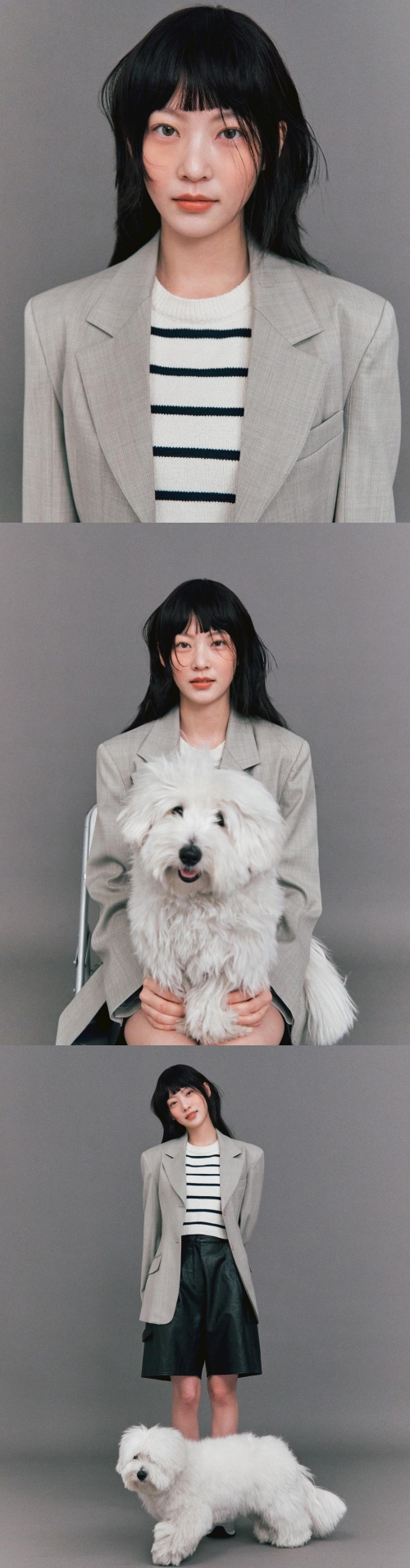 写真には、前髪をバッサリ切ったキュートな“オン眉バング”のコン・スンヨンの姿。髪を切ったからか、以前と比べてかなりあどけない印象だ。ボーダーのシャツにブレザー、個性的なボトムスが目を引く。