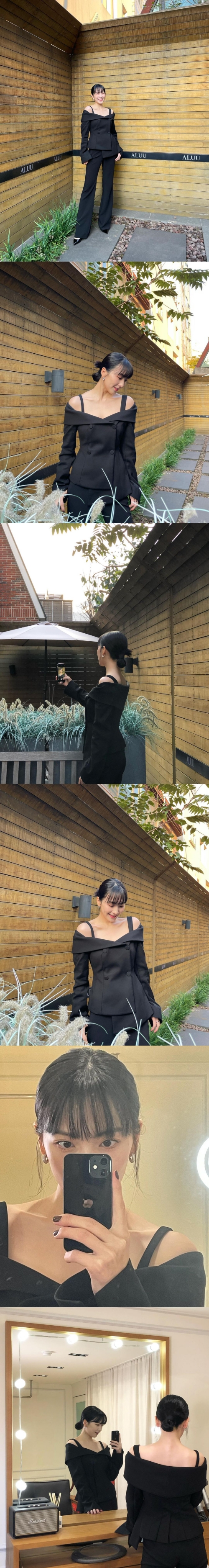 投稿された写真には、屋外で撮影する知英の姿が。黒で統一されたオフショルトップスにボトムスを合わせ、アクセサリーを着けず、シンプルに着こなしている。