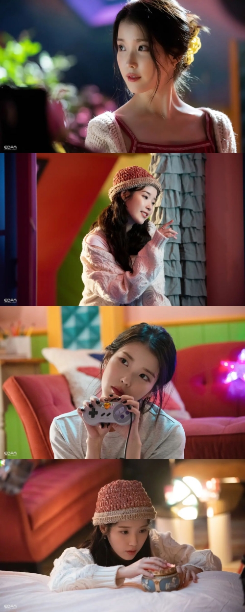 写真には、ゲーム機を持ちながら一点を見つめたり、窓際で物思いにふけたり、さまざまなシーンでラブリーな魅力を誇るIUの姿が写っている。