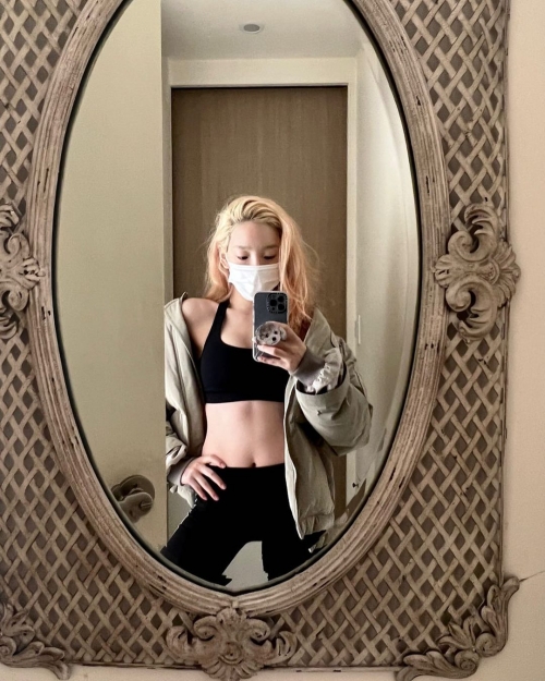 写真には、鏡の前で自撮りをするテヨンの姿が写っている。ブラトップにレギンスというスポーティーな格好を披露した。