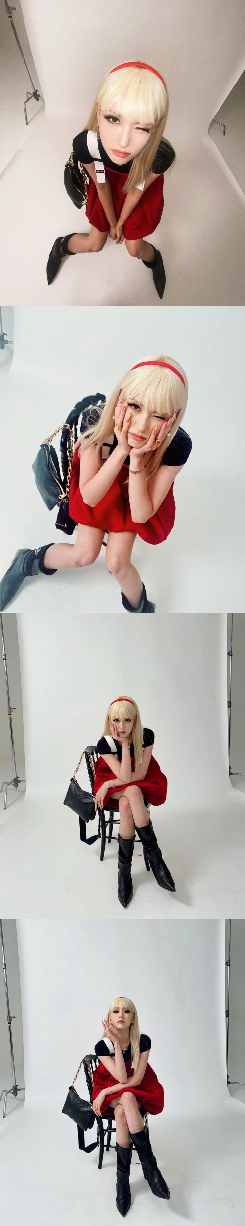 写真には、広告ビジュアルの撮影に臨むチョン・ソミの姿が。ブロンドのロングヘアに赤いカチューシャをしており、ボリューム感のあるミニスカートがよく似合っている。