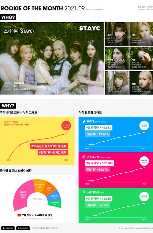 『K-Pop Radar』は10月21日、「STAYCの新曲『STEREOTYPE』のミュージックビデオがわずか52時間で再生回数1000万回を達成した。前作『ASAP』に比べ、約2倍も短縮された驚くべき成長ぶり」と、STAYCを9月のルーキーに選定した理由を明かした。