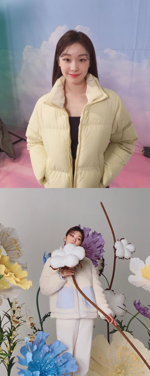 雲や花などの幻想的なセットの中で、笑顔を浮かべるキム・ヨナ。パステルイエローのダウンコートが彼女の雪のような白い肌によく合っている。