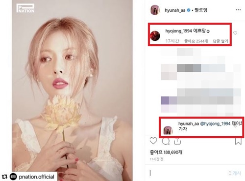 写真が掲載されてから間もなくして、イドンは投稿に対するコメント欄に「可愛い」と書き込んだ。ヒョナもまた同コメントに対して「デートに行こう」と答え、愛情を表現している。