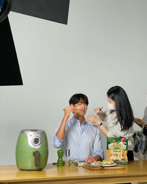 写真には、広告の撮影合間にヘアメイクを受けているキム・ウビンの姿が写っている。カメラの存在に気づいたキム・ウビンは、箸を持ちながらウィンクをして、見る者を魅了した。