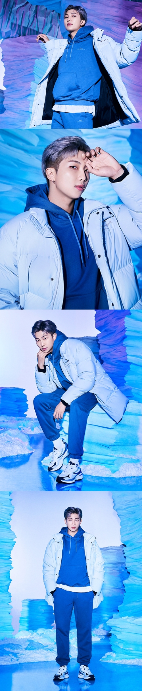 RMは青のパーカーと白のダウンジャケットをスタイリッシュに着こなした。ブルーアッシュの髪色も今回の衣装やコンセプトによく合っている。