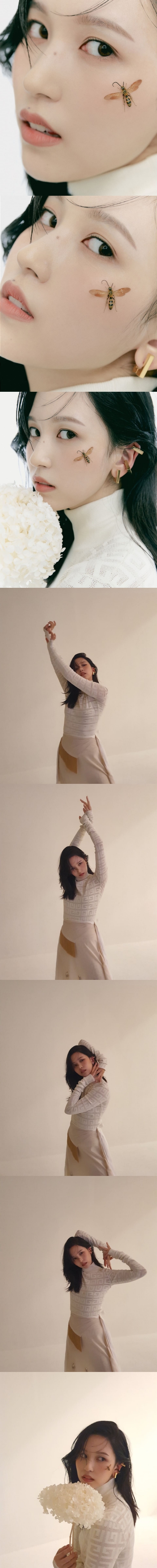 写真には、儚げな表情が美しいミナの姿が。頬には蜂が止まっており、幻想的な雰囲気だ。四角いスティック状のゴールドピアスやイヤーカフが、ミナの洗練された魅力をより一層引き出している。