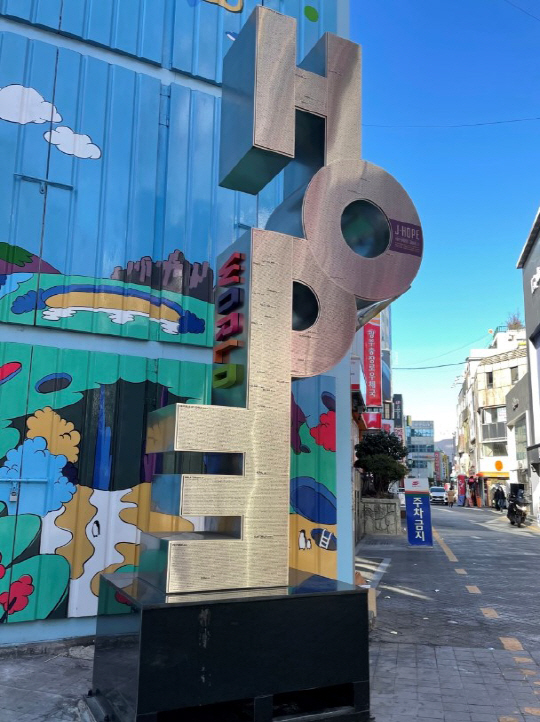 そして、その象徴と言えるのが光州東区にある「K-POPスター通り」。この通りにはJ-HOPEの誕生日(2月18日)にちなんで全世界から募った2万1800通のメッセージが刻まれた造形物「HOPE WORLD」が建てられている。さらには、J-HOPEのソロ曲『Chicken Noodle Soup(feat. Becky G)』のジャケット写真なども描かれたシャッター壁画などもある。