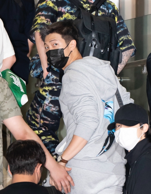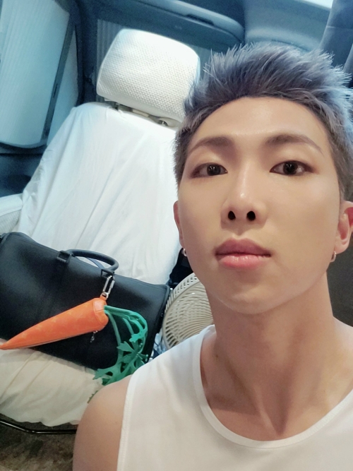 RMはグレーの上下スウェットをチョイス。自慢の体格の良さを生かして、男らしく着こなしている。ニンジンを模したポーチは、RMの近況写真に度々登場することから、彼のお気に入りアイテムだということがうかがえる。