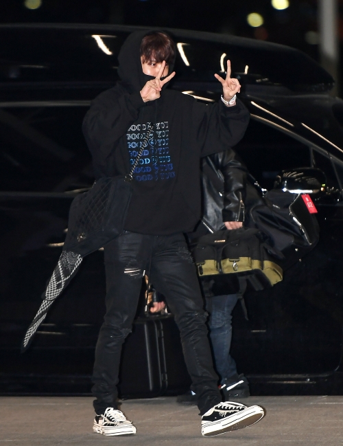遊び心のあるアイテムを好むJ-HOPEは、ブラックコーデもキュートに着こなした。2019年4月29日、アメリカで行われる『ビルボード・ミュージック・アワード』(Billboard Music Awards)に参加するために仁川国際空港を訪れたBTS。J-HOPEは、インパクト大のロゴパーカーを主役にしたコーディネートを見せた。モノトーンのスカーフをバッグに巻いて、小物使いのセンスも発揮している。