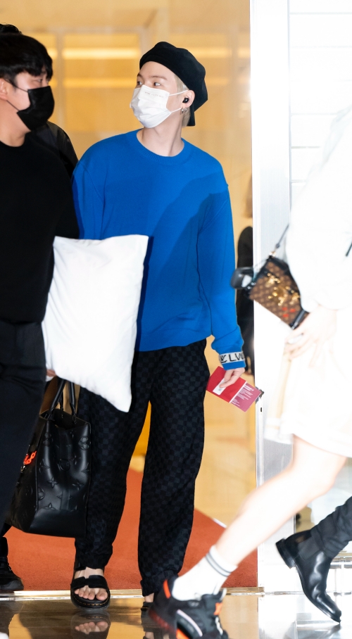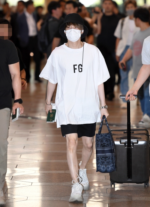2019年7月4日、日本でのスタジアムツアー『LOVE YOURSELF: SPEAK』のため、金浦国際空港に登場したBTS。SUGAは色違いで持つほどお気に入りの「Fear Of God」のロゴTシャツに、黒のバケットハットとハーフパンツを合わせたラッパーらしい“リラックスストリートコーデ”を完成させた。