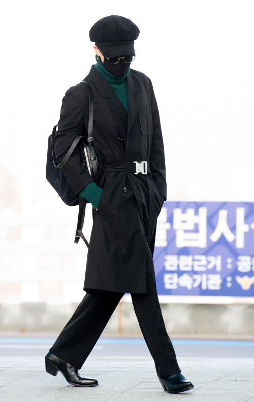2020年2月20日、アメリカのテレビ番組『TODAY Show』に出演するため、空港に姿を見せたBTS。ミニマルなコーデのバランスに定評があるJIMINは、差し色を取り入れた上級者の着こなしを披露。黒のトレンチコートはJIMINの中性的な魅力をより一層引き出している。