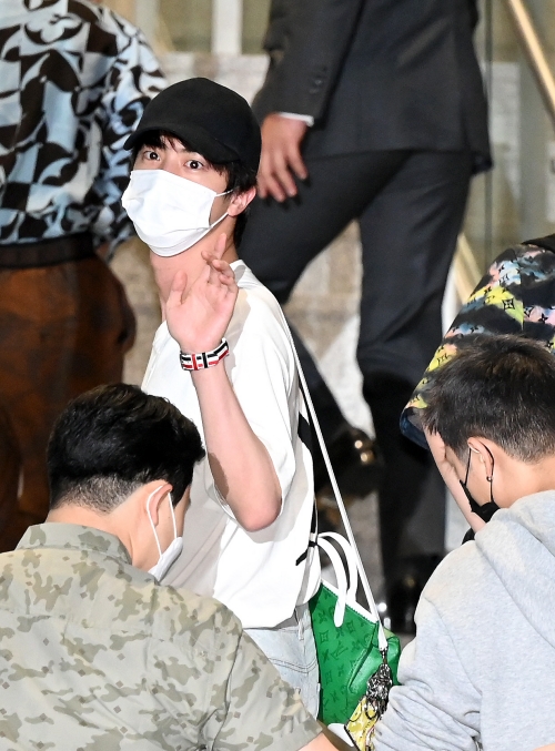 JINは緑のショルダーバッグをアクセントにしたシンプル且つ上品なコーディネートを披露。パッチワークが施されたデニムは、J-HOPEのパーカーと合わせるとセットアップに。空港ファッションでも家族のような仲睦まじさを見せて、ファンを喜ばせた。