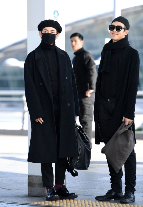 2016年12月1日、香港で開催される「2016 MAMA」に参加するために空港に登場し、メディア関係者に笑顔を見せたVとRM。2人とも全身黒のアイテムで統一しているが、そのスタイルは大きく異なる。Vはベレー帽やロングコートなどのクラシックなアイテムを使うことで、全体的にモダンな仕上がりに。対照的にRMは、キャップをアクセントにしたストリートMIXスタイルを披露している。