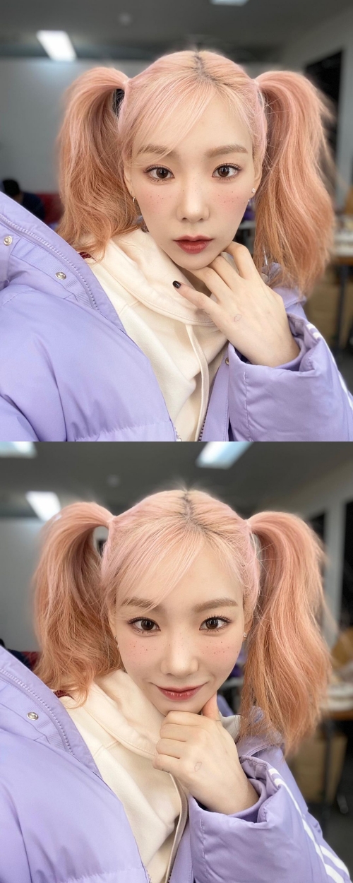 テヨンはクリーム色のパーカーにラベンダカラーのダウンコートを羽織りながら自撮りをしている。