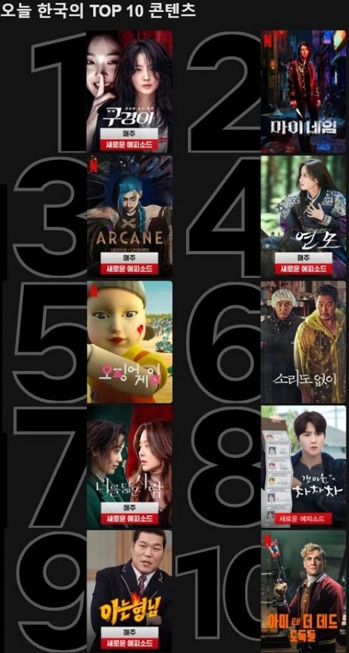 同日、Netflixの韓国TOP10では、『調査官ク・ギョンイ』に続いて、『マイネーム』が2位、米アニメ『アーケイン』が3位、KBSのドラマ『恋慕』が4位、『イカゲーム』が5位、映画『声もなく』が6位、JTBCのドラマ『あなたに似た人』が7位、tvNのドラマ『海街チャチャチャ』が8位、JTBCバラエティ番組『知ってるお兄さん』が9位、映画『アーミー・オブ・シーブズ』が10位に名前を上げた。