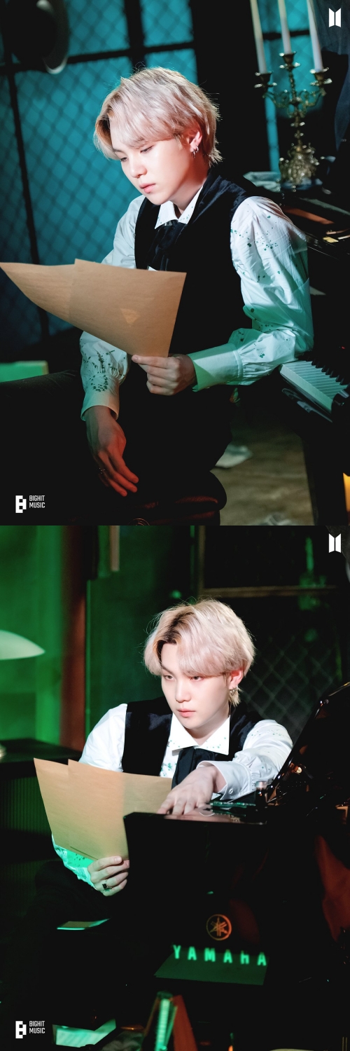 SUGAはスプラッシュプリントのブラウスにベスト、リボンタイで“ミステリアスなピアニスト”に扮している。
