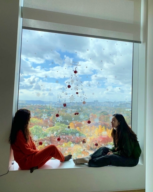 写真には、窓際で向かい合いながら座るチェ・ジウとシン・エラの姿が。チェ・ジウはシン・エラを見つめているが、シン・エラは外の色とりどりの紅葉に目を奪われれている。