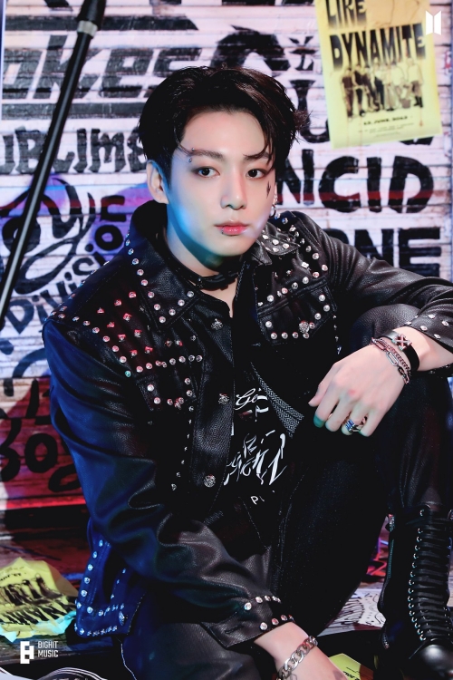 かきあげ前髪で端正な顔立ちを見せたJUNG KOOK。眉や唇にはピアスが光り、なんともいえない色気を醸し出している。パンクなライダースジャケットを羽織った姿は、まるでハードロッカーのようだ。