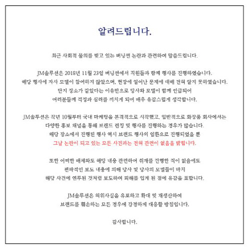 韓国の化粧品ブランドJMsolutionが、クラブ「バーニングサン」への関与疑惑について釈明した。