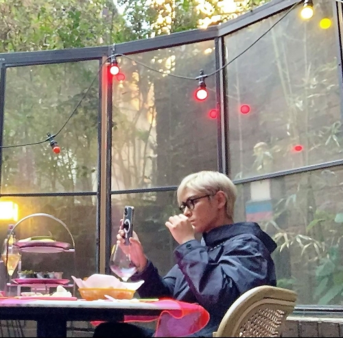 写真には、レストランでスマホを眺めるT.O.Pが写っている。