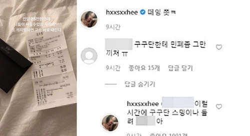 その後、ハン・ソヒは5日当時に食事をしたと思しき飲食店の領収証の写真を掲載し、「1人当たり25万ウォン(約2万5000円)のお会計。あんたが奢れるものなら奢ってみろ。また“犬XX”と暴言を吐こうものなら、すぐに告訴する」と警告している。