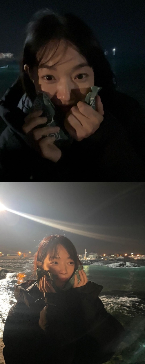 写真には、夜の海をバックにどこか一点を見つめるシン・ミナの姿が。カイロを持った両手を頬に押し当てて寒さを凌いでいる。