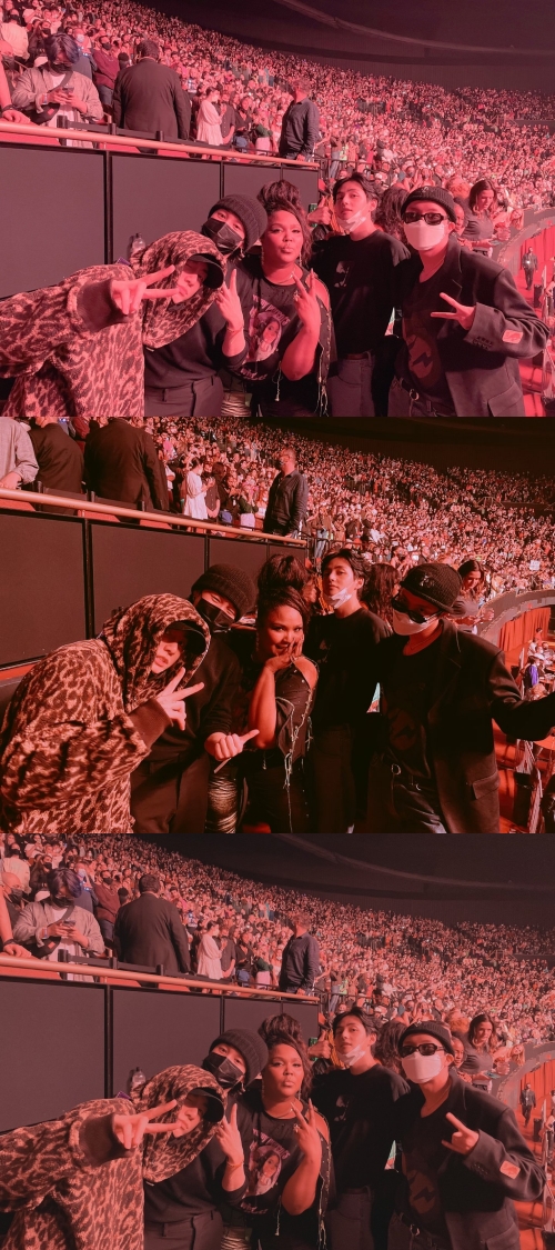 写真には、ライブ会場で記念写真を撮るJ-HOPE、JIMIN、V、JUNG KOOKの姿が。米シンガー兼ラッパーのリゾ(LIzzo)も一緒に写っており、ピースサインをしたり親指を立てたりしながらクールな表情を見せている。